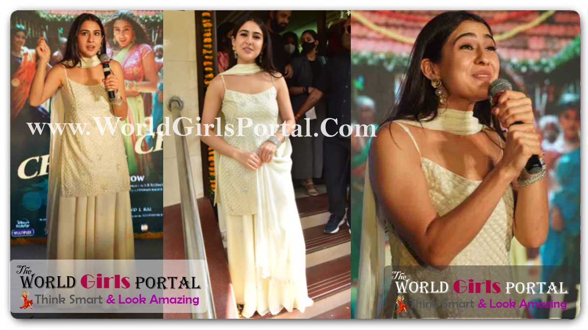 For the launch of the song “Chaka Chak” from her upcoming film “Atrangi Re,” Sara Ali Khan made a resplendent appearance in her favorite ethnic ensemble. She chose to adorn an ivory-toned sharara suit that epitomized grace and charm.